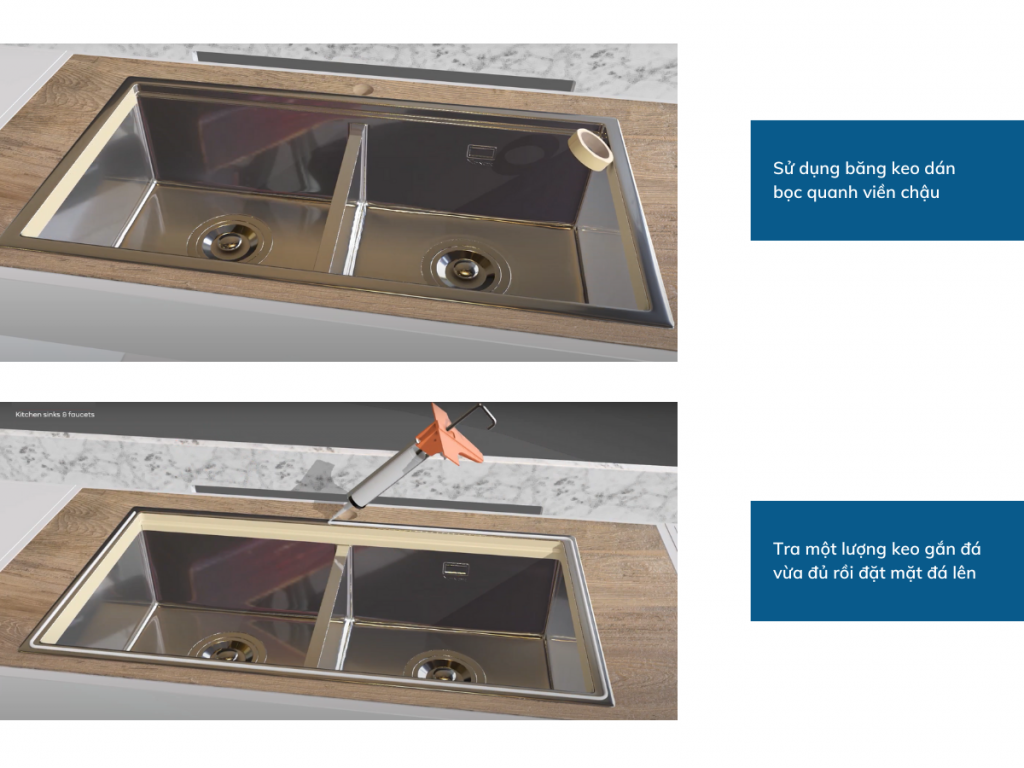 Bơm keo quanh viền hố bàn đá đã cắt tại bước 2 rồi đặt bồn rửa lên và ấn nhẹ cho chậu lọt lòng được cố định chắc chắn. Nếu bồn có vòi nước đi kèm, cần lắp đặt trước, sẽ rất khó khăn sau khi hoàn thiện bồn rửa rồi mới lắp vòi vì không gian lúc này rất chật và nhỏ.