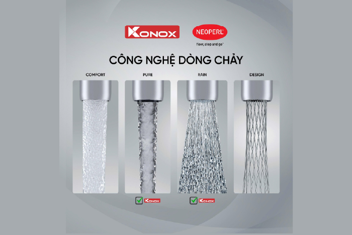 Mẫu vòi rửa chén Konox này sở hữu thiết kế dạng bo tròn, đầu vòi cong toát lên vẻ nhẹ nhàng và tinh tế hài hòa với mọi gian bếp cao cấp và hiện đại.